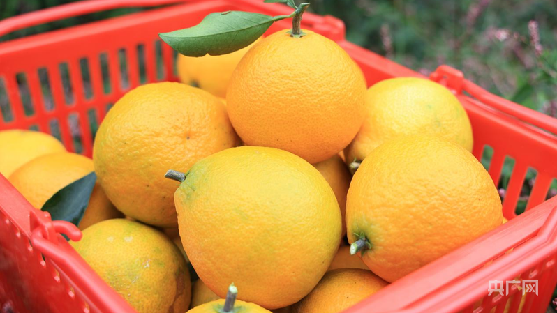 果冻橙缀满枝头(央广网发 周艳梅 摄) 永州绿生源农业科技发展有限公司技术指导蒋小军介绍道:“这个果冻橙是爱媛28号,它的水分比较足,肉质比较细嫩,口感吃起来脆脆嫩嫩的。”