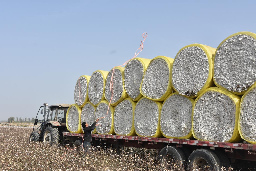 10月21日,在新疆阿克苏地区沙雅县的棉田中,棉农在固定棉花包。新华社记者顾煜 摄 走进沙雅县红旗镇多勒昆村宽阔平坦的千亩高标准棉田,雪白的棉朵缀满棉枝,采棉机穿梭在棉田之间,伴随着阵阵轰鸣声,饱满的棉絮被源源不断吸入机身,不一会儿,一个个紧实的圆柱形棉包便从采棉机尾部滚落,排列在田间。 “今年我管理着1900亩棉田,亩产量500公斤左右。”在棉田里摸爬30多年的棉农艾则孜·艾合麦提坦言,以前自家30亩棉花,家里3个人采摘要20天,如今无人机打药,采棉机采收,效率、效益双双大幅提升。“近2000亩棉花10天就能收完,以前想都不敢想,挣钱多了还不累。” 如今,搭载北斗卫星导航系统的机械化播种、采收,无人机飞防已成为新疆棉花标配。今年采收季,新疆累计投入7500余台采棉机,其中跨区作业的采棉机超3100台。植保无人机在天山南北广阔棉田里处处可见。“去年我们单一设备营业额超过了1700万元。”新疆沙湾市一家农用无人机公司负责人说。