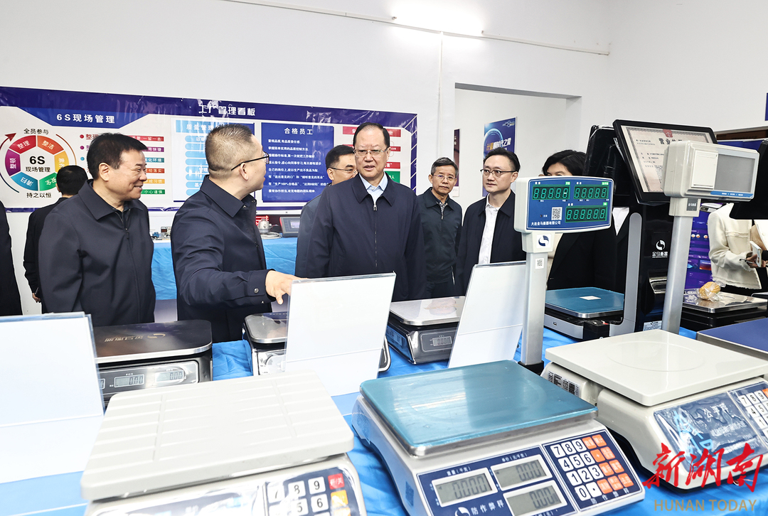 (毛伟明在金马衡器调研。) 在衡阳智能衡器计量产业园,毛伟明一行来到衡阳计量人才实训中心、威胜信息、金马衡器、广电计量等地,了解园区人才引育、平台搭建、产业发展等情况。他指出,要加速招引高端人才、集聚头部企业、突破核心技术,不断涵养集技术研发、会展销售、检验检测、标准服务等于一体的产业生态,持续提升园区竞争力和影响力。