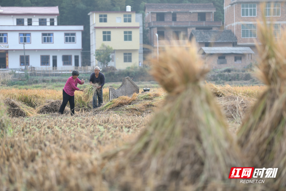 稻田一望无际,仿佛延伸至天边。 红网时刻新闻10月31日讯(记者 秦楼 王杨)10月30日,位于邵阳市邵东市灵官殿镇的省级粮食生产万亩综合示范片,双季稻迎来大丰收。连绵起伏的金色稻浪中,沉甸甸的稻穗压弯了禾秆。种粮户罗自生与老伴正操作着脱粒机进行田间作业。 伴随着机器的轰鸣,一束束饱满的稻穗被迅速卷入,金黄的谷粒瞬间分离,罗自生高兴地说:“今年收成好,亩产达到了1200斤。”