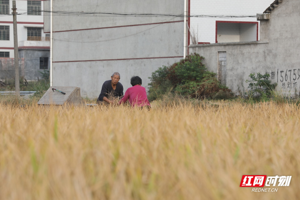 种粮户罗自生(右)与老伴在稻田中忙碌着。