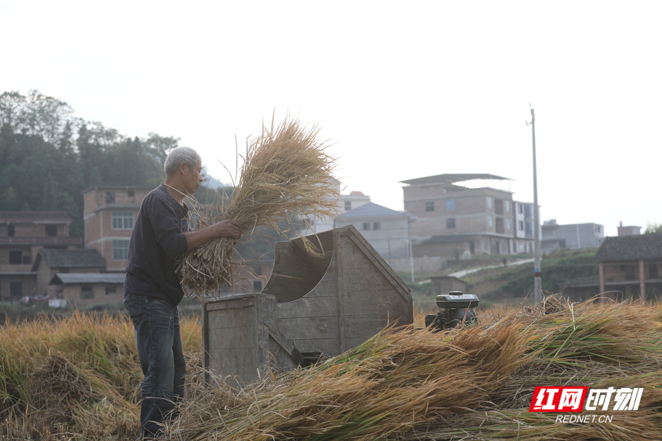 种粮户罗自生忙着用机器脱谷。