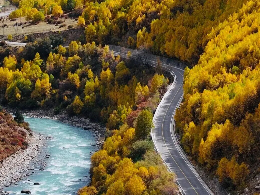 拍照攻略: 怎么去: 从拉萨市区开车约2.5小时就能到,不用爬山,停好车走个五六分钟就到浅滩。 拍照技巧: 手机开“风景模式”就行,不用调复杂参数。 最佳时间: 下午3-5点,阳光不逆光,雪山不会拍得发黑。 避坑提醒: 千万别踩湖边的软土!看着干燥,踩进去可能陷鞋。 林芝公路旁彩林观景:不爬山的秋日童话 林芝公路旁彩林观景