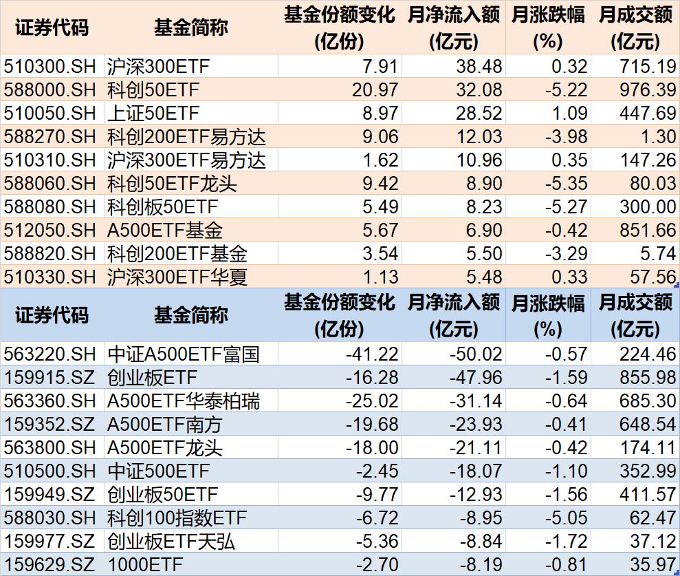 每经记者|叶峰 每经编辑|赵云 10月市场总体呈现震荡态势,沪指累计涨1.85%,一度站上4000点,再创十年新高。创业板指累计跌1.56%,科创50指数震荡调整,累计下跌超5%。 行业主题上看,证券、科创芯片等相关ETF被资金看好,而化工、旅游相关ETF被资金抛售。 10月约千亿元资金借道ETF进场 10月市场总体呈现震荡态势,三大指数月线涨跌互现,但资金借道ETF进场迹象明显,股票型ETF和跨境型ETF合计净流入资金996.8亿元。 其中,沪深300ETF、科创50ETF在10月获得超30亿元资金净流入。