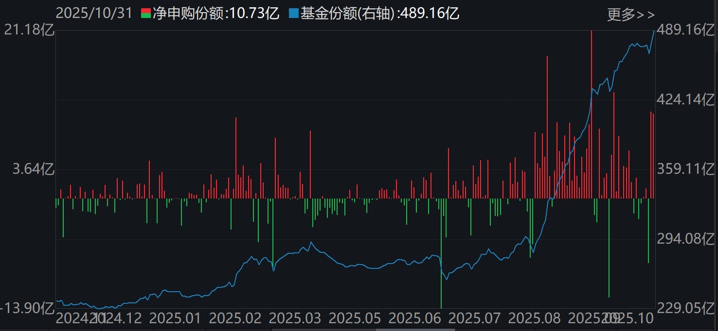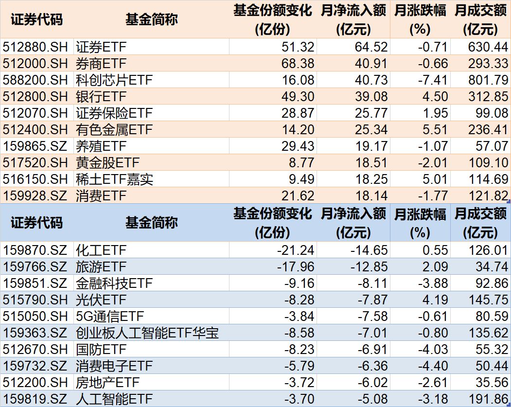 10月行业主题相关ETF资金流动情况 在资金流出方面,化工ETF、旅游ETF和金融科技ETF份额分别减少21.24亿份、17.96亿份和9.16亿份,分别净流出资金14.65亿元、12.85亿元和8.11亿元。 值得注意的是,10月,券商板块持续获资金青睐。证券ETF、券商ETF基金份额一路攀升创出新高。