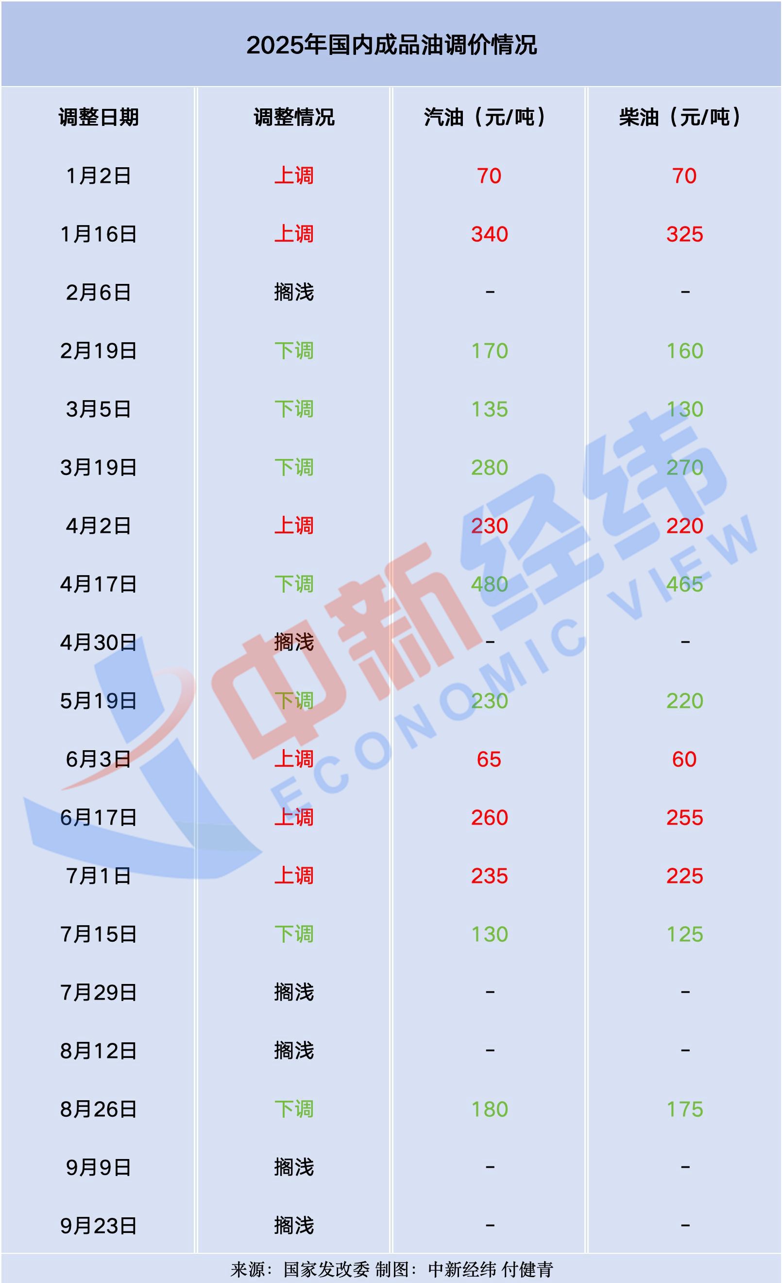 13日24时,国内成品油调价窗口将开启。综合机构观点,成品油价格调整或现年内第八次下跌。 隆众资讯分析,本轮调价周期内国际原油价格震荡下跌,导致测算的成品油调价幅度由正转负。供应端来看,OPEC+10月已经启动165万桶/日的新一轮增产,市场依然担忧长线的供应过剩风险,且新一轮增产周期将延续至明年。需求端来看,美国炼厂进入秋季检修期,对原油需求季节性减弱。此外美国关税问题依然带来风险,拖累全球经济和需求预期。 根据金联创测算,截至10月11日第9个工作日变化率为-1.37%,参考油种均价64.30美元/桶,国内汽柴油应下调75元/吨。按照当前原油变化率计算国内汽、柴油预计下调75元/吨,折算汽、柴油将下调0.06~0.07元/升。零售价兑现下调后,居民出行成本有所减少。汽油方面,按油箱容量为50L的小型车计算,加满一箱油节约3元左右;柴油方面,按油箱容量为140L的大货车计算,加满一箱油节约8.3元左右。 中新经纬梳理发现,国内油价已经历十九轮调整,呈现“六涨七跌六搁浅”的格局,国内汽、柴油价格较去年底分别下跌405元/吨和390元/吨。