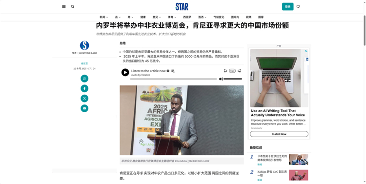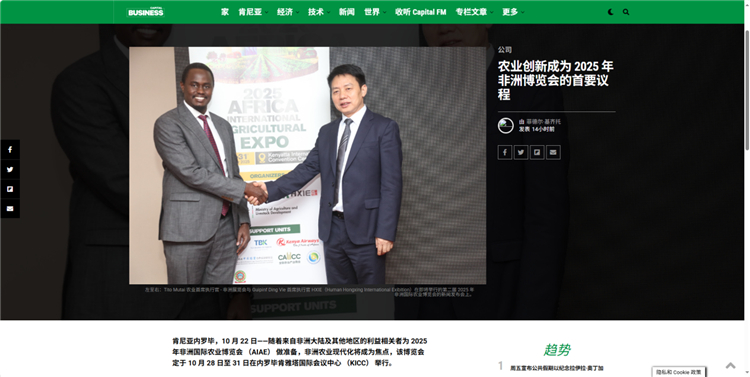 湖南红星国际展览有限公司丁贵平副总经理。 作为主办方,红星会展依托中非经贸博览会与中非深度合作先行区两大国家级平台,通过市场化机制激活国家级对非资源,推动展会成为中非农业合作从“短期展销”转向“长效赋能”的核心载体。 非洲大陆正站在农业现代化的关键路口,2025非洲国际农业博览会以创新为桨、以合作为帆,正驶向一个由技术革新、贸易畅通、生态可持续共同绘制的农业新纪元。 这不仅是肯尼亚的机遇,更是全球农业发展的里程碑——在这里,每一个合作协议都是通向共同繁荣的桥梁,每一项技术突破都是对未来粮食安全的庄严承诺。 |