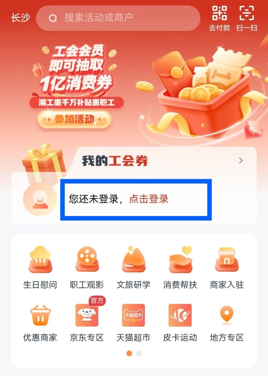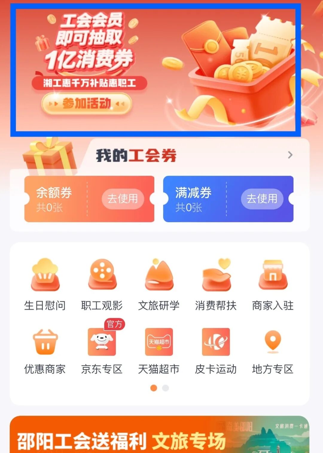 @工会会员朋友们,长沙市总工会“相约工会 悦享工惠”促消费活动正在进行中。 工会文旅券可畅游价值超2200元的热门景点,最高满200元减100元。 这一大波福利,你都领了吗?赶紧看过来,手把手教你领! 福利详情 在此次活动中,长沙市总工会将发放500万元专属福利券,诚邀长沙职工共赴一场属于星城的秋日美好。 1 工会文旅券 仅需支付0.01元核验会员身份,便能兑换“长沙工会文旅卡”,畅游欢乐水寨、长沙生态动物园、宁乡野趣乐园等总价值超2200元的热门景点。 “长沙工会文旅卡”激活后365日有效,您可以慢慢丈量长沙及周边的每一寸美好。 2 工会普惠券 满200元减100元、满100元减50元、满30元减20元的普惠券,福利覆盖长沙职工生活方方面面,优惠直减超给力。 领取方式 本次活动分为十月、十一月、十二月三期,采用先报名再抽签的形式 进入“云闪付APP”首页“湘工惠”入口