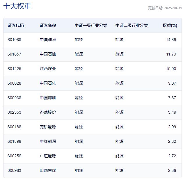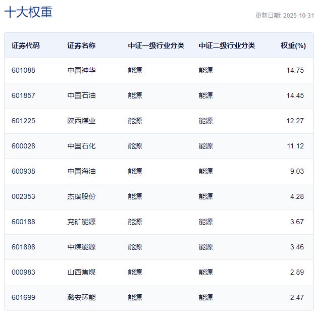 中证能源指数主要权重股 点评:能源ETF广发(159945)半日涨幅也达到3.01%,该ETF规模较小,只有0.25亿份,其追踪的是中证全指能源指数。 中证全指能源指数是一个反映沪深两市能源行业内公司股票整体表现的指数。该指数从中证全指样本股能源行业内选择流动性和市场代表性较好的股票构成指数样本股。