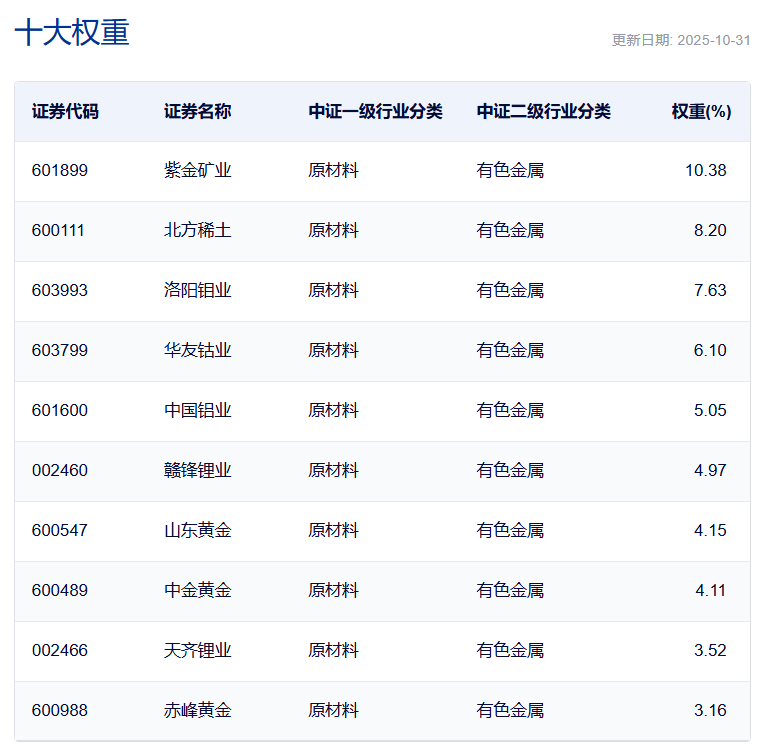 往后看,有色矿业板块仍有望走出独立行情 铜方面,近期海外铜矿端仍有扰动,10月23日大型智利铜矿生产公司安托法加斯塔宣布25年铜矿产量或仅达到指引下限,且因通货膨胀原因或下调25年资本开支预期。25年以来已有包括卡莫阿-卡库拉矿、全球第二大矿Grasberg等多个项目均下调中期产量指引,累计下调近50万吨,使得今年铜矿供给或与去年持平甚至小幅下降,较去年供给4.5%的增速显著下降。中期铜矿供给端或持续处于紧张状态,中期铜价上行仍有支撑。 黄金方面,在经历了近两个月的快速上涨后,黄金价格波动率提升。从中长期维度看,黄金可能或有短期良性调整,但上涨趋势仍未改变。在货币超发及财政赤字货币化背景下,美元信用体系受到挑战;加上全球地缘动荡频发推动资产储备多元化,黄金作为安全资产的需求持续提升。中长期“美联储开启降息周期+海外宏观政策不确定性加剧+全球去美元化趋势”对于金价构成一定支撑。 东方证券指出,在全球货币宽松周期、资源战略地位提升及新旧产业转型共振下,有色金属进入供需紧平衡驱动的新周期,走势相对独立。工业金属中,铜等品种因供需格局改善受到关注;小金属领域,锂、稀土等战略资源在新能源转型背景下需求持续增长。此外,黄金作为避险资产,在地缘政治不确定性中保持配置价值。整体来看,有色金属行业受益于结构性供需矛盾和新旧产业需求叠加,呈现独立于市场的运行特征。 为什么矿业ETF(561330)值得关注?龙头更集中,【黄金+铜+稀土】占比更高 根据ifind数据,截止2025年10月31日,年内矿业ETF(561330)跟踪指数相比中证有色指数超额近10%。为何矿业ETF跟踪指数表现更优? (1)龙头更集中,把握行情更精准 矿业ETF(561330)跟踪中证有色金属矿业主题指数,成份数量为37只,前十大成分股占比7.26%;而中证有色指数成分股数量为60只,前十大成分股占比48.3%。有色矿业指数的龙头股更加集中。 中证有色金属矿业指数前十大成分股