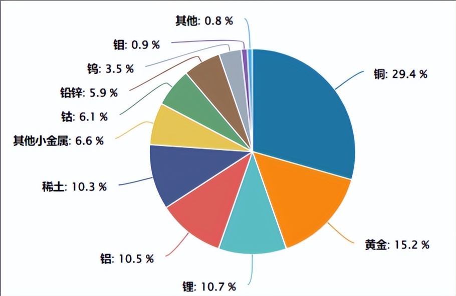 注:数据来源中证指数公司,截止2025年10月31日。指数成分股仅供参考,不代表投资建议,不预示未来。 (2)【黄金+铜+稀土】占比更高,一键把握热门赛道 中证有色金属矿业主题指数中【黄金+铜+稀土】占比更高,为54.9%,而中证有色指数【黄金+铜+稀土】占比为51.1%,中证有色金属矿业指数受黄金、铜、稀土等热门板块等利好催化更明显。 中证有色金属矿业指数行业分布