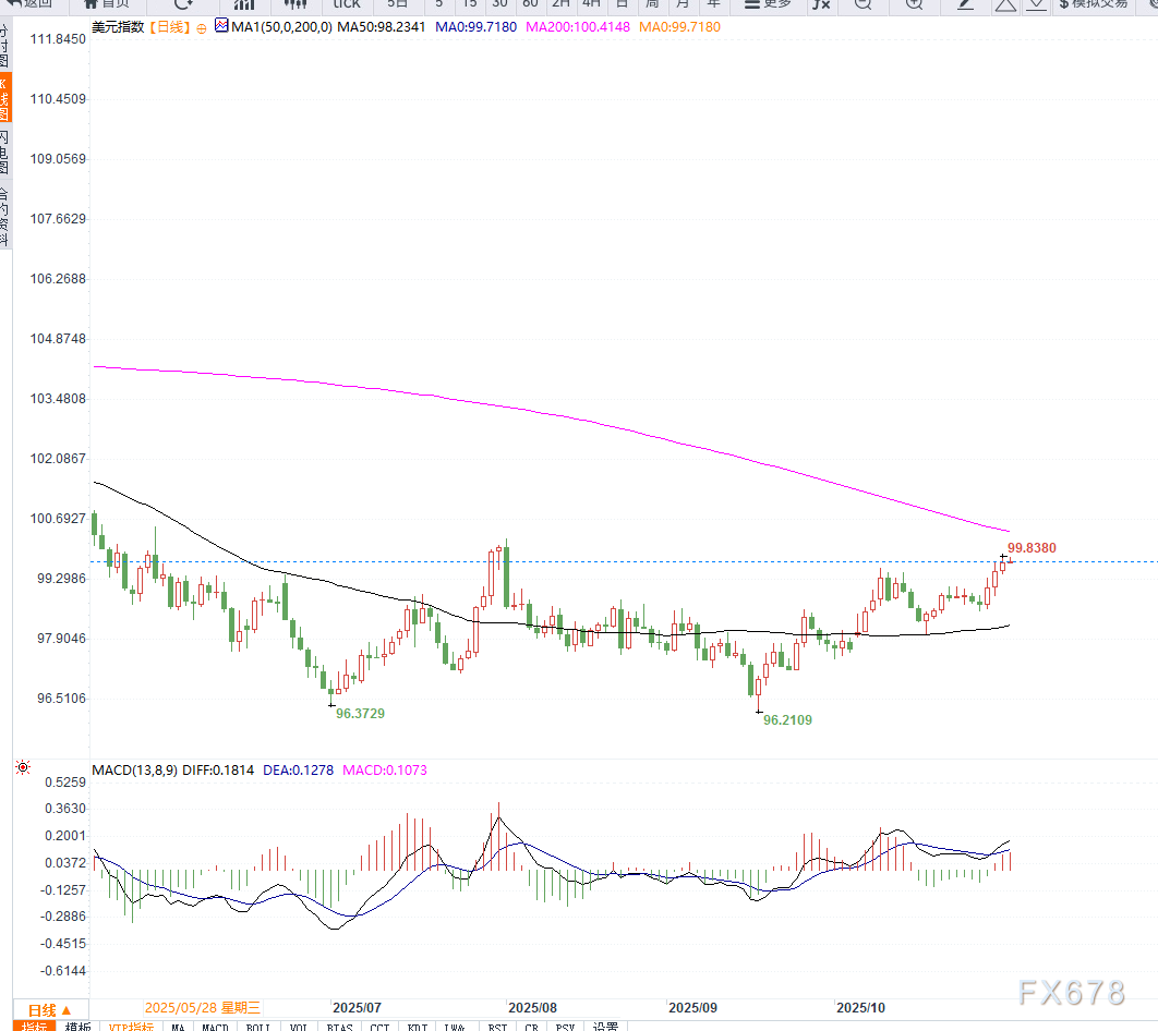 美元指数(DXY)周一在亚洲时段表现坚挺,交投于99.75附近,反映市场对美联储鹰派立场的重新定价。 ![]() 达拉斯联储主席洛根与克利夫兰联储主席哈马克上周五均表示,他们更倾向于维持利率不变,而非降息; 堪萨斯城联储主席施密德亦指出,他更担忧通胀仍“过高”,而非劳动力市场疲弱。这些鹰派言论强化了市场对美联储可能提前结束宽松周期的预期,推动美元全线走强。 根据CME“美联储观察工具”数据,市场对12月再次降息的预期概率已从上周的93%降至68%。分析人士认为,这反映出投资者对通胀回升与政策过度放松的担忧情绪正在升温。 纽约外汇分析师David Porter指出:“美联储内部的分歧使市场意识到当前的货币政策已接近临界点。美元的强势主要来自政策层面的谨慎态度,而非经济数据的改善。” 然而,市场风险并未消退。美国政府停摆已进入第六周,共和党与民主党在预算谈判中依旧僵持不下。若局势延长至本周末,停摆时间将创历史纪录。投资者担心,这一政治僵局可能削弱美国经济活动,从而在中期内削弱美元支撑。 若制造业PMI数据意外走弱,美元指数可能短线承压。 从技术面来看,美元指数在日线图上自98.50反弹后,呈现温和上行趋势。目前价格运行在9日指数移动平均线(EMA)上方,短线支撑位于99.20,阻力位于100.10。 14日相对强弱指数(RSI)徘徊在56附近,显示多头动能仍占优势,但上行空间有限。若价格突破100.10关口,将打开进一步上行至101.00的通道;反之,若跌破99.00支撑,则可能回测前期低点98.30。 ![]() 当前美元指数的走势主要受政策预期和政治风险的双重驱动。美联储官员的鹰派基调为美元提供短线支撑,但政府停摆风险及制造业放缓迹象可能削弱中期上行动能。 整体来看,若后续数据仍显示经济具韧性,美元指数有望维持在99-100区间震荡偏强格局;但若停摆冲击扩大或通胀放缓超预期,则美元或在高位承压。