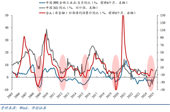 EPS,Earning Per Share的缩写,即每股税后利润,中文叫“每股收益”或“每股盈利”。EPS上涨,通常意味着公司的赚钱能力在增强,这是推动股价长期上涨的根本动力。所以,试想一下,如果EPS得到修复,上市公司利润增长回来了,是不是推动股市上涨就有了新引擎。 那么何时EPS才能得到修复呢?华创证券根据历史经验数据判断:这个时间在2026年1月。因为经济开始“转暖”是有信号的——“历史经验来看,M1通常领先PPI6-9个月”。 咱来通俗解释下,M1是即时支付能力,可以理解为社会上“马上就能花的钱”,它像经济活动的“温度计”;PPI可以看作是“工业品出厂价格”,可以理解为“原材料成本的价格”。