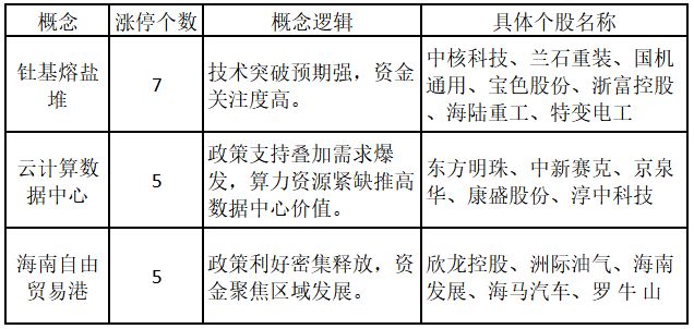 (注:行业涨停板个股越多,说明该行业被资金重点关注,是当前热门行业。) 从概念特征来看,今日涨停板个股中,钍基熔盐堆、云计算数据中心、海南自由贸易港等概念的个股最多。