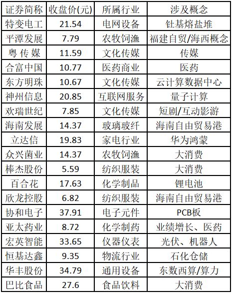 (注:创出历史新高的涨停股,说明该股人气旺盛、趋势明确,且上方无阻力,延续原上涨趋势概率较大。) 涨停板个股中,股价创出近一年新高的个股有19只(不包括创出历史新高的个股),包括特变电工、平潭发展、粤传媒、合富中国、东方明珠、神州信息、欢瑞世纪、海南发展、立达信、众兴菌业、棒杰股份、百合花、欣龙控股、协和电子、亚太药业、宏英智能、恒基达鑫、华丰股份、巴比食品,具体如下表所示。
