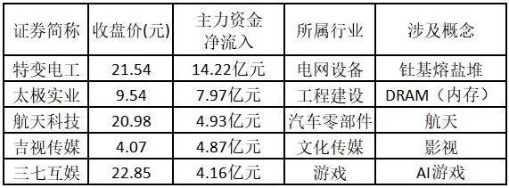 (注:创出近一年新高的涨停股,说明该股走出重要突破行情,值得重点关注。) 从主力资金来看,今日涨停板个股中,主力资金净流入金额排名前5的个股分别为特变电工、太极实业、航天科技、吉视传媒、三七互娱。