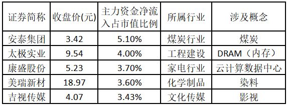 (注:主力资金净流入金额越多的涨停股,说明该股被主力资金重点关注,值得重点关注。) 主力资金净流入金额占市值比例排名前5的个股分别为安泰集团、太极实业、康盛股份、美瑞新材、吉视传媒。