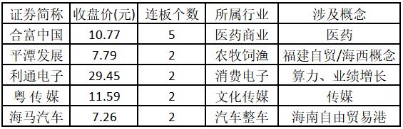 (注:封板资金越多的个股,说明该股被资金追捧,其延续上涨概率较大。) 从连板情况来看,今日首板个股有56只;2连板的个股有9只;3连板及以上的个股有1只。今日连板数排名前5的个股包括合富中国、平潭发展、利通电子、粤传媒、海马汽车,具体如下表所示。