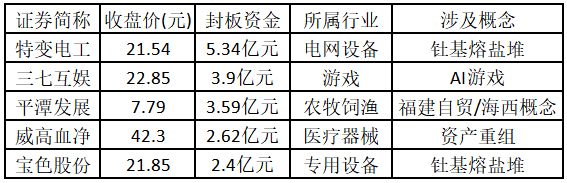(注:主力资金净流入金额占市值比例越高的个股,说明该股被主力资金重点关注,值得重点关注。) 从封板资金来看,今日涨停板个股中,封板资金排名前5的个股包括特变电工、三七互娱、平潭发展、威高血净、宝色股份。欢迎大家关注微信公众号“道达号”,其“道达涨停复盘”栏目为大家解读。