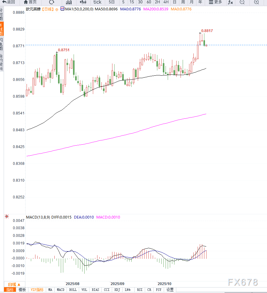 欧元兑英镑周一于欧洲早盘延续上行趋势,交易价格维持在0.8775附近。市场情绪受到英国国内政治与财政不确定性影响,英镑承压下滑。 ![]() 英国经济分析师乔纳森·克拉克表示:“财政政策的不确定性削弱了投资者信心,而秋季预算的细节将决定市场对英镑中期走势的判断。” 市场普遍预计,英国央行将在周四的利率会议上维持现行利率不变,主要因通胀水平依旧高企,而政策制定者希望在财政政策出台后再评估下一步货币行动。 与此同时,欧洲央行(ECB)在上周的会议上连续第三次维持存款利率2.0%不变。 欧洲央行行长克里斯蒂娜·拉加德强调:“央行目前处于一个良好位置,并将采取一切必要措施维持这一状态。” 此外,ECB理事会成员约阿希姆·纳格尔周一表示,欧元区最新经济数据与央行预测大体一致,但决策层仍保持政策灵活性以应对潜在风险。 在法国,财政部长勒科努(Sébastien Lecornu)本周将与议员展开闭门会谈,试图在预算问题上达成共识。据市场调查显示,如果预算谈判失败并引发不信任投票,法国政府可能面临解体风险,从而引发提前选举。 一位欧洲政治研究员指出:“法国财政僵局若持续,将对欧元构成阶段性压力。” ![]() 从短期来看,欧元兑英镑的上行主要受英国财政不确定性驱动,而非欧元区内部基本面改善。若英国秋季预算如市场担忧般偏紧,英镑或继续承压。然而,法国政治风险可能在中期对欧元形成反制压力,使得EUR/GBP走势保持震荡格局。
