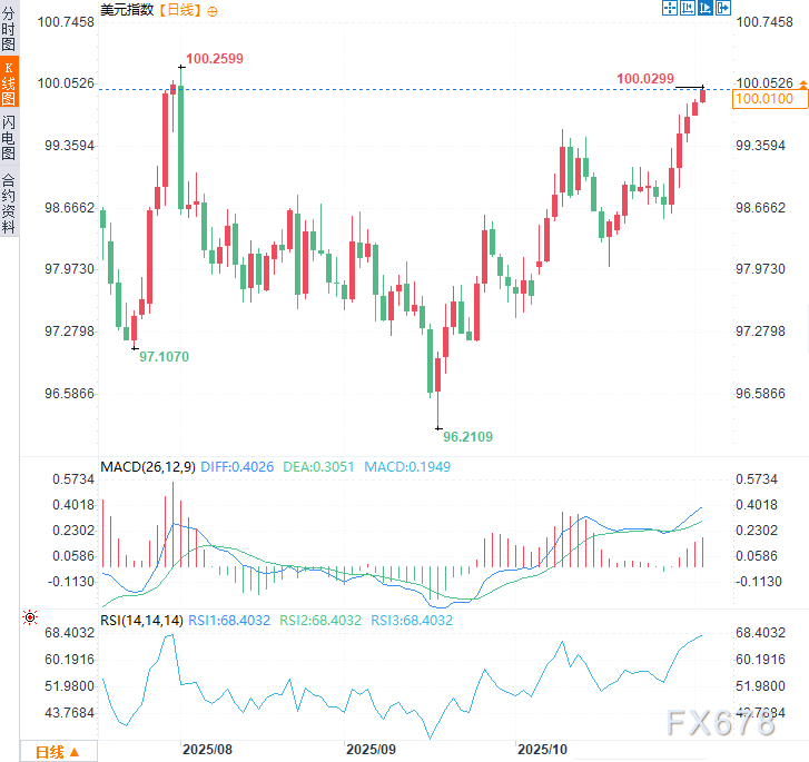 0美元指数周二(11月4日)连续第五个交易日走强,涨幅约0.15%,一度达到100.03的近三个月高点,若此处动能转弱,可能标志ABC平势调整的C浪开启。但目前该关口仍是多空双方激战争夺的关键点位。澳元兑美元延续前四个 ...