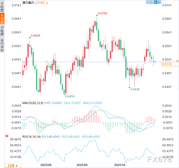 美元指数周二(11月4日)连续第五个交易日走强,涨幅约0.15%,一度达到100.03的近三个月高点,若此处动能转弱,可能标志ABC平势调整的C浪开启。但目前该关口仍是多空双方激战争夺的关键点位。澳元兑美元延续前四个交易日跌势,跌幅约0.08%。 ![]() 美元指数技术分析 考虑到本周美国将公布关键经济数据,此时需保持谨慎——这意味着美元指数本周可能出现波动。 周线与日线RSI(14)指标均确认当前上涨趋势完好,且均未进入超买区间,因此美元指数在完成C浪调整前,仍有可能上探101关口。 但若本周数据表现疲软,市场可能迅速重估美联储降息预期,从而拖累美元走低。 风险并未消退。美国政府停摆已进入第六周,即将成为历史上最长的停摆纪录,共和党与民主党在预算谈判中依旧僵持不下。投资者担心,这一政治僵局可能削弱美国经济活动,从而削弱美元支撑。这可能为澳元提供支撑——尤其若澳洲联储在维持利率不变的同时释放鹰派信号。 ![]() 澳元兑美元技术分析:收益率利差与期权头寸暗示澳元下行空间有限 澳大利亚国债收益率与期权市场头寸的相关性显示,澳元回调幅度可能受限。2年期澳债收益率持续上行,且澳美2年期利差已领先澳元汇率显著走阔。 尽管澳元兑美元1日期权隐含波动率一度升至三日高位,但1周与1个月期限的隐含波动率仍处于温和水平。此外,风险逆转指标表明看涨期权需求(做多头寸)相对看跌期权(做空头寸)持续保持稳健。 澳元兑美元日线现黄包车十字星,暗示下行动能减弱 澳元虽连续四日收跌,但黄包车十字星形态表明看跌动能正在衰退。周一低点(0.6517)守在9月低点(0.6483)上方,凸显出初步支撑已现。鉴于澳洲联储可能实施鹰派按兵不动,澳元兑美元或将迎来短期反弹,同时美元会展开小幅回调。 不过,基于对美元在C浪完成前仍将走强的大局判断,澳元任何修复行情在初步反弹后或将受限。 ![]() 北京时间9:37,澳元兑美元交投于0.6531/32。