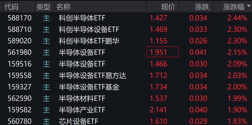 每经记者|叶峰 每经编辑|肖芮冬 半导体概念股早盘走强,中微公司涨超7%,华海清科、拓荆科技涨超5%,盛美上海涨超3%。 受盘面影响,多只半导体设备相关ETF涨超2%。