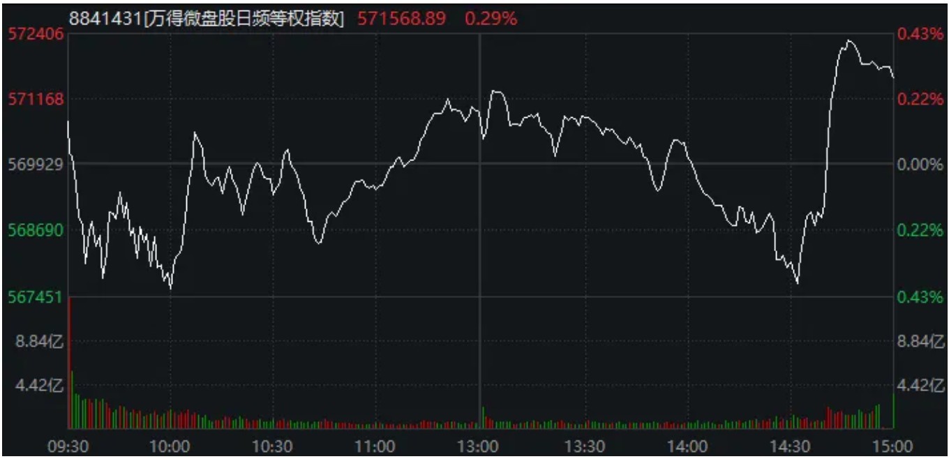 每经记者|赵云 每经编辑|叶峰 11月4日,市场全天缩量调整,创业板指跌近2%。截至收盘,沪指跌0.41%,深成指跌1.71%,创业板指跌1.96%。 板块方面,福建自贸区、银行、冰雪产业等板块涨幅居前,贵金属、医药、机器人等板块跌幅居前。 全市场超3600只个股下跌。量能继续萎缩,沪深两市成交额不足2万亿元,较上一个交易日缩量1914亿元。 今天是11月第2个交易日,市场格局仍是红利股与微盘股偏强。 一方面,是午后持续下行的大盘在14:33突然走出了V字反转,颇有“神奇两点半”的以为,其中反弹最猛的当属微盘股指数;