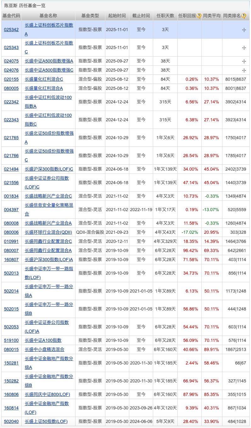 2、ETF主题机会 上市银行业三季度财报显示经营格局稳定,预计全年营收和利润增速将延续改善。另一方面,年底步入长线资金配置时段,有助于催化银行股市场表现。可关注银行ETF等产品。 四、明日重点关注新发基金1、基金简称:长盛上证科创板芯片指数 基金类型:股票型证券投资基金、指数基金 基金经理:陈亘斯 业绩比较基准:上证科创板芯片指数收益率×95%+人民币银行活期存款利率(税后)×5% 基金经理部分过往业绩: