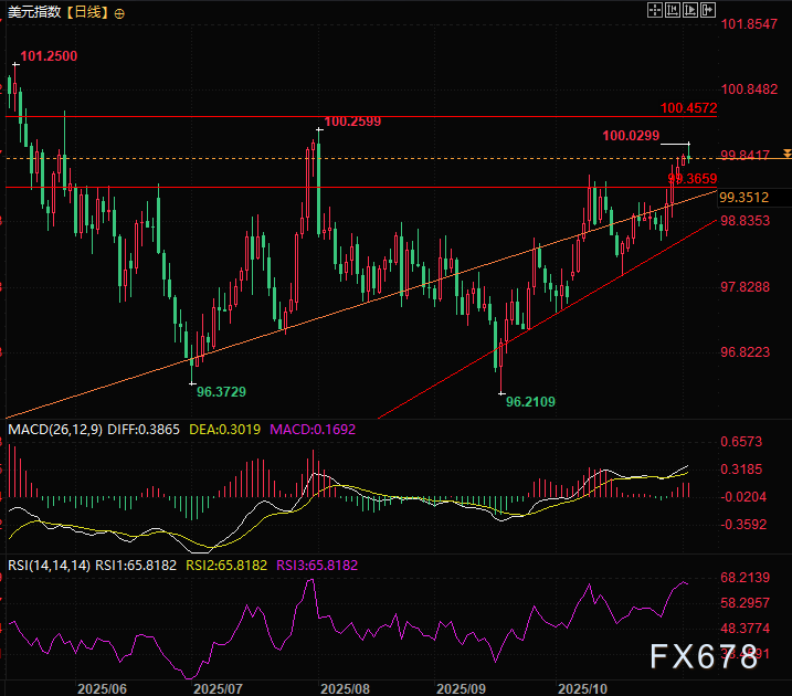0周二(11月4日)亚欧交易时段,美元指数走出冲高回落走势,盘中一度短暂涨超100整数关口,之前该指数已连续第四个交易日上涨,目前交投于99.80附近。 当前美元指数的波动,正围绕美联储政策预期、美债收益率 ...