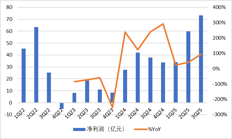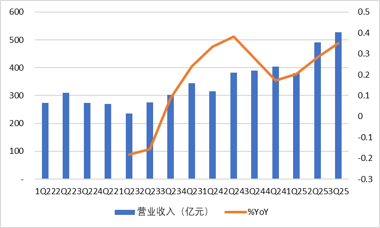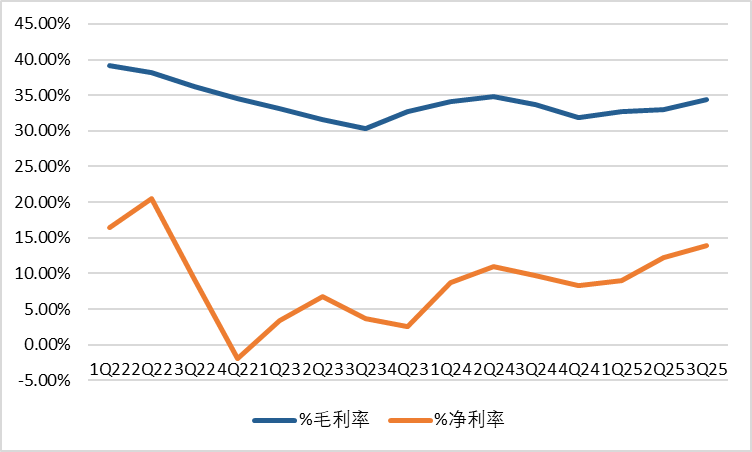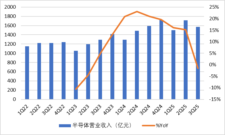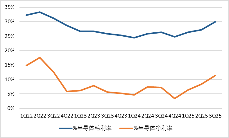 【半导体】 2025Q3实现营业收入1570.74亿元,yoy-1.5%; 2025Q3净利润177.73亿元,yoy+56.9%。 2025Q3销售毛利率/销售净利率分别为29.97%/11.32%,分别yoy+3.60pct/+4.10pct。 成长动因: