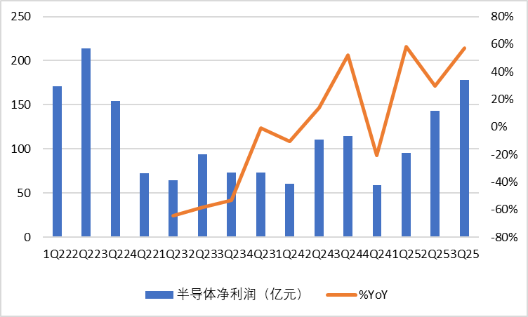 0【半导体整体】2025Q3实现营业收入1570.74亿元,yoy-1.5%;净利润177.73亿元,yoy+56.9%。2025Q3销售毛利率/销售净利率分别为29.97%/11.32%,分别yoy+3.60pct/+4.10pct。半导体板块受益芯片设计、制造、设备等多个细 ...