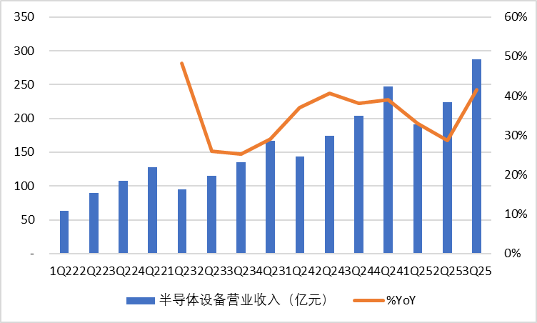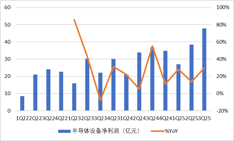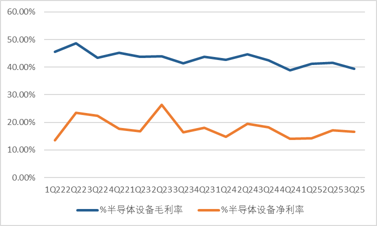 资料来源:wind,参考申万行业分类 半导体设备方面,景气高企。 2025Q3实现营业收入287.74亿元,yoy+41.5%; 2025Q3净利润47.88亿元,yoy+29.9%。 2025Q3销售毛利率/销售净利率分别为39.47%/16.64%,分别yoy-3.03pct/-1.49pct。 成长动因:存储扩产及工艺升级等持续拓宽市场空间,叠加国产替代发展,相关厂商设备验证交付及量产节奏顺利推进,基本面较为强韧。