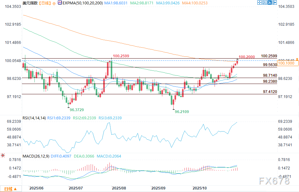 周二(11月4日),美元指数升至三个月高点,在略微回落之前达到100.215。这是自8月初以来首次突破心理关口100,但未能超过8月1日的高点100.257。下一个主要技术阻力是200日移动均线100.421,这一水平可能会决定当前五日反弹的方向。 ![]() 美联储的分歧使降息预期蒙上阴影 美元的上涨得益于对12月降息预期的减弱。美联储上周降息后,主席鲍威尔表示,12月不一定会再次降息。交易员们也相应做出了调整,芝加哥商品交易所(CME)的美联储观察工具现在显示12月降息的可能性为65%,较一周前的94%大幅下降。 持续的政府停摆暂停了官方经济数据的发布,投资者只能依赖私人数据。周一的供应管理协会(ISM)制造业调查显示,美国工厂活动连续第八个月收缩,突显了潜在的疲软。尽管如此,由于没有明确的政策信号和有限的数据,美元继续受益于避险资金流动和降息预期的减少。 英镑和欧元受到国内压力的削弱 英镑和欧元的走弱进一步支撑了美元指数。英国财政大臣里夫斯在预算案前指出财政限制和持续的通货膨胀后,英镑兑美元下跌0.61%,至1.3057美元。欧元下跌0.2%,至1.149美元,接近三个月低点。整体风险情绪仍趋于防御性,增加了对美元的买入需求。 日元走强,但干预风险犹存 日元兑美元走强0.4%,至153.56,此前接近此前促使日本政府进行干预的水平。日本财务大臣片山重申,正在紧急监测汇率走势,暗示如果日元再次走弱,可能会采取行动。 市场预测:由于美联储前景和风险情绪支撑美元,谨慎看涨 ![]() 美元指数的近期前景在12月美联储降息预期回落以及避险资产需求持续的支撑下,仍保持谨慎看涨。CME美联储观察工具现在显示再次降息的可能性仅为65%,而一周前为94%,交易员正在重新评估美元风险敞口,倾向于在政策不确定性期间持有美元。与此同时,全球风险情绪仍然脆弱,股市承压,防御性资产需求上升,进一步巩固了美元的基础实力。 然而,反弹面临着200日移动均线100.421的技术阻力。持续高于这一水平可能表明交易员正在计入更鹰派的美联储立场或全球风险厌恶情绪加剧,从而为向101.977水平进军开辟道路。相反,未能突破可能反映出由于美国制造业数据疲软以及政府停摆期间官方经济报告的持续缺失,市场信心有限。在这种情况下,交易员可能会重新评估多头头寸,可能引发向98.714-98.238回调支撑区的回落。