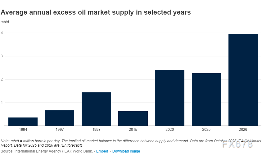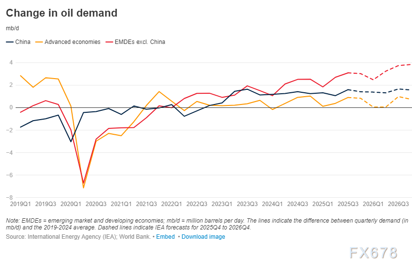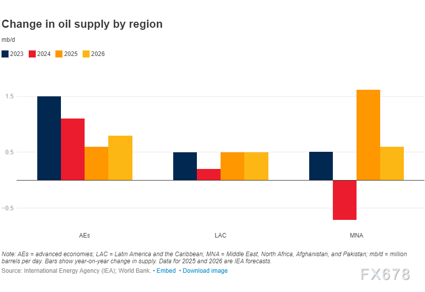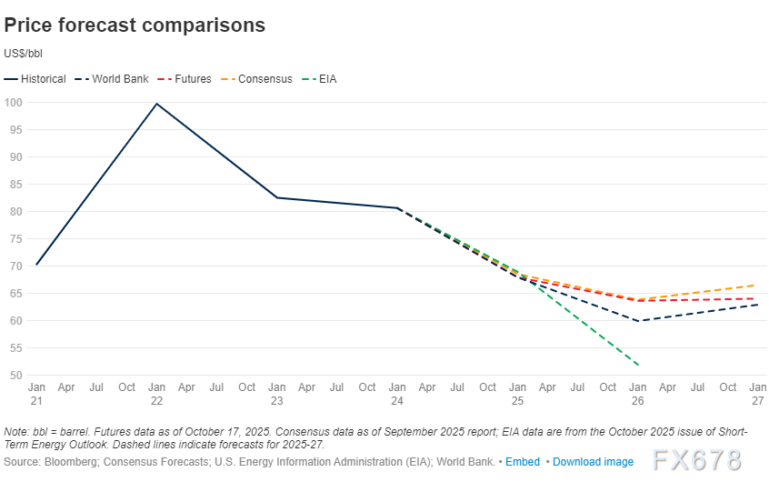 周三(11月5日)亚欧时段原油市场走出探底回升走势,目前交投于60.49,涨幅近乎与昨日收盘价持平,油价开盘探底仿佛跟随了全球股市整体大幅下挫或是将股市下挫反应的经济活动景气收缩预期直接表现在了油价上。 ![]() 2025年油价整体走势与近期波动 美国宣布对俄罗斯石油公司实施新限制后,月末油价上涨5%,10月29日布伦特原油收盘价约为每桶65美元。 2025年全年,受持续的贸易政策紧张局势和对供应过剩的担忧影响,油价整体下跌,但地缘政治事件偶会引发油价短期上涨。布伦特原油价格下跌导致乌拉尔原油价格跌破每桶60美元——这是2025年2月起生效的价格上限——随后9月又实施了更低的价格上限,即每桶47.6美元。 全球石油需求:增长持续疲软,区域分化明显 石油需求增长持续疲软。2025年第三季度,全球石油需求预计仅增加80万桶/日(mb/d),同比增幅0.7%,这表明相较于2015-2019年的平均水平,需求增长仍处于疲软状态。这一趋势预计将持续,2025年全球石油年需求量将达1.038亿桶/日,2026年将达1.045亿桶/日。 ![]() 发达经济体的石油消费量预计保持稳定,而中国因电动和混合动力汽车加速普及,石油需求增长可能放缓。印度是全球石油需求增长的主要贡献者之一,其需求增长预计将由液化石油气(LPG)、汽油、石脑油和柴油推动。 全球石油供应:新增产能驱动,区域增长有别 随着新增产能投产,2025年和2026年石油供应预计将增加。2025年石油产量预计同比增长300万桶/日(增幅2.9%),达到1.061亿桶/日,2026年预计将进一步增至1.085亿桶/日。 2025年,中东和北非、阿富汗及巴基斯坦(MNA地区)的石油供应增长预计将恢复,拉丁美洲和加勒比地区(LAC地区)将加速增长,而发达经济体的供应增长则会放缓。2025年石油供应增量中,近一半来自石油输出国组织及其合作伙伴(OPEC+),这反映出该组织提高了产量目标。 ![]() 供需失衡:产量激增叠加需求疲软,全球石油供过于求显现 产量激增与消费增长疲软的叠加,正导致全球石油供过于求。2025年第三季度,隐含石油过剩量(供应减去需求)预计为270万桶/日,部分原因是OPEC+自4月以来多次上调产量目标。 尽管2025年观察到的库存增长仅反映了约一半的隐含过剩量,但近期市场动态越来越多地表明全球石油供应过剩正在显现:中东地区近期有多艘原油货船滞销,与此同时,海上油轮载油量也出现激增。按年度计算,国际能源署(IEA)预计2025年石油过剩量为230万桶/日,2026年将增至400万桶/日,比2020年疫情爆发期间的过剩量高出160万桶/日。 ![]() 石油价格预测与风险:整体偏向下行,存在双向可能性 石油价格预测的风险偏向下行。布伦特原油价格预计2025年平均为每桶68美元,2026年降至每桶60美元,随后随着市场状况企稳,将回升至每桶65美元。 最主要的下行风险包括OPEC+可能进一步上调产量目标,其他下行风险还包括贸易紧张局势重启以及政策不确定性加剧。 从上行风险来看,若石油市场比预期更紧张,油价可能会超过基准预测。 出现这一结果的原因可能包括:非经合组织(OECD)主要消费国的需求强于预期,以及受OPEC+限制或美国产量下降影响,供应增长受限。此外,中东或乌克兰等地区的冲突升级,以及额外限制(包括美国近期对俄罗斯石油公司采取的措施)对市场的影响,也可能推动油价高于当前预测。 ![]() 技术分析: 美原油12月期货合约目前维持在箱体上半区域呈现震荡走势,压力位在61.30支撑位在59.40和58.48附近。 MACD,RSI目前显示空方力量转弱,但两个指标依旧维持在荣枯线之下,油价如果能继续维持震荡,等待均线走平,有望向上箱体发起突破,但目前依然是空头走势。 ![]() 北京时间15:40,美原油12月期货合约现报60.52美元/桶。