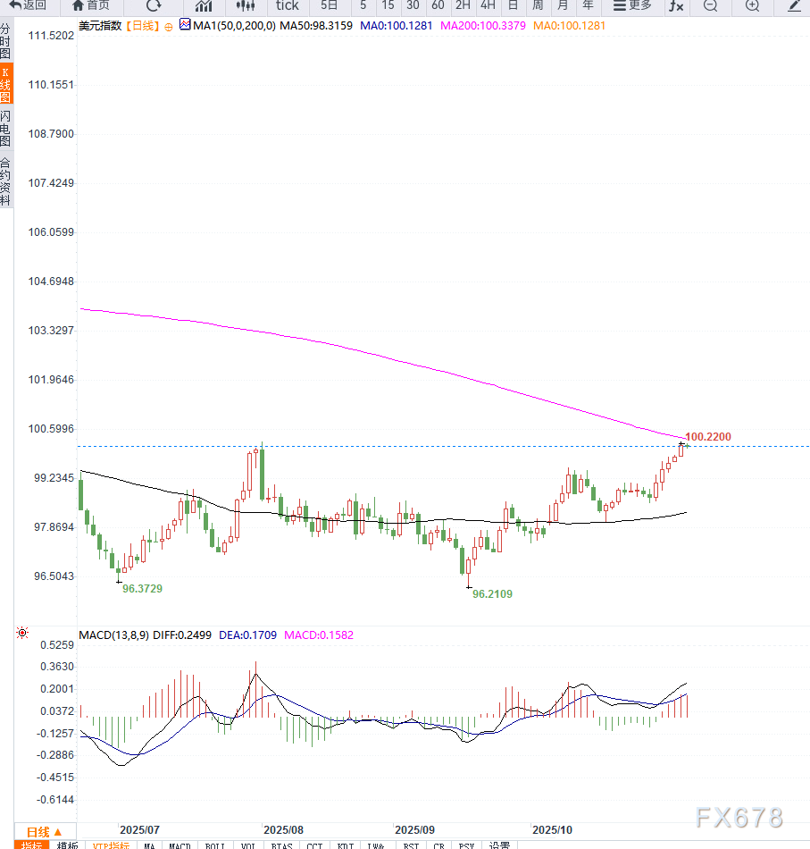 美元指数(DXY)在亚洲交易时段回落至 约100.15,此前一度触及三个月高点100.25。 ![]() 美联储政策对美元形成一定支撑。10月会议后,联邦基金目标利率维持在 3.75%-4.0%,主席Jerome Powell表示,年底进一步降息“并非板上钉钉”。。 交易员根据CME FedWatch工具计算,12月降息概率已从上周的93%降至约70%,这为美元提供一定底部支撑。 市场还关注即将公布的美国10月ADP非农就业数据和ISM服务业PMI。 ADP非农就业预计新增 25,000个职位,而此前一度录得3.2万个职位减少。若数据强于预期,可能短期提振美元对其他主要货币的表现。 技术面来看,DXY短线回落,但仍维持在 100–101 区间的震荡格局。短期支撑位关注100附近心理关口,上方阻力位在 101-101.5。美元指数的后续走势仍将受美国财政僵局、美联储政策态度及经济数据表现共同影响。 ![]() : 美元指数短期呈现“财政停摆压制与美联储政策支撑并存”的格局。美国政府停摆延长增加经济不确定性,对美元形成抛压;但美联储年底降息不确定性及即将公布的经济数据为美元提供底部支撑。 若财政僵局缓解或经济数据强于预期,DXY可能重回上行通道;若停摆持续或经济数据不及预期,则美元承压回落。