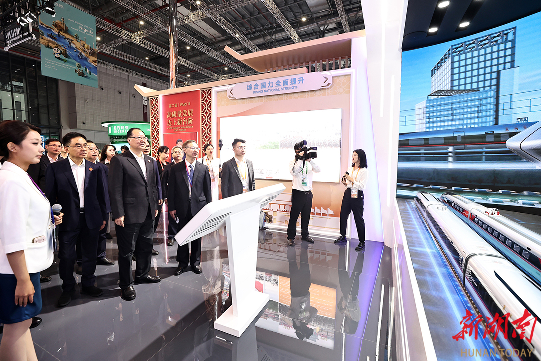 (毛伟明考察湖南常设馆。) 进博会湖南常设馆聚焦“开放湖南, 湘遇世界”主题,以山水为幕、以人文为脉、以智造为桥,组织60余家湘企整装亮相,布展面积较上一届增加了一倍。毛伟明饶有兴致地参观展陈,勉励大家精心打造“湖南城市会客厅”,更好发挥展洽联动作用,全方位展示“湘”品形象、立体式讲好湖南故事、精准化对接全球资源。