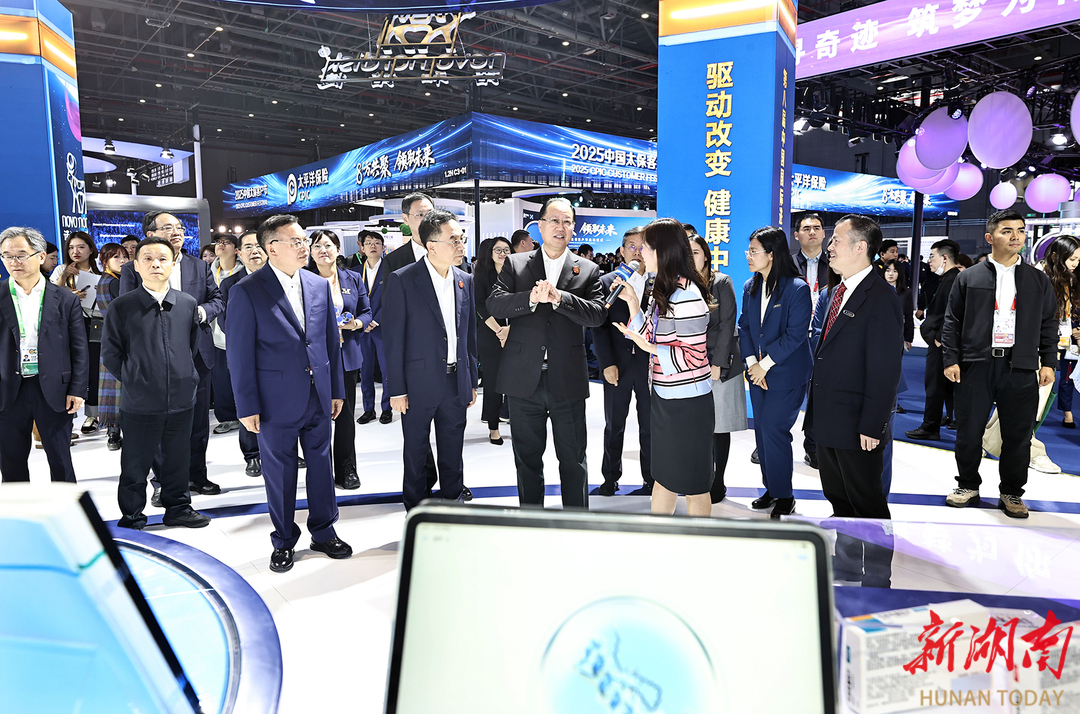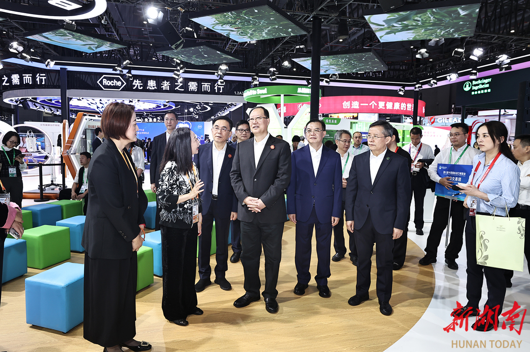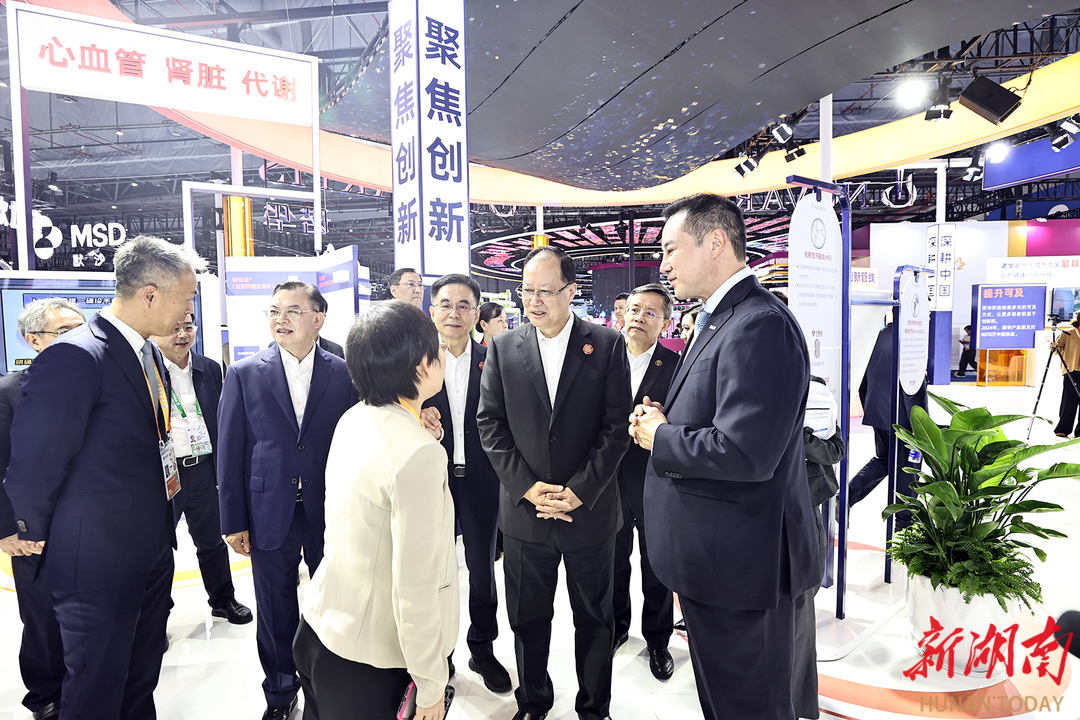 (毛伟明参观拜耳展位。) 在医疗器械及医药保健展区,毛伟明一行先后参观了飞利浦、诺和诺德、诺华、拜耳等企业展台,了解新技术、新产品、新服务,现场推介湖南投资机遇。他说,生物医药与医疗器械产业是湖南13条重点推进产业链之一。诚邀大家来湘共促技术变革、共拓产业空间,与湖南高质量发展同频共振、在未来赛道携手奔跑。