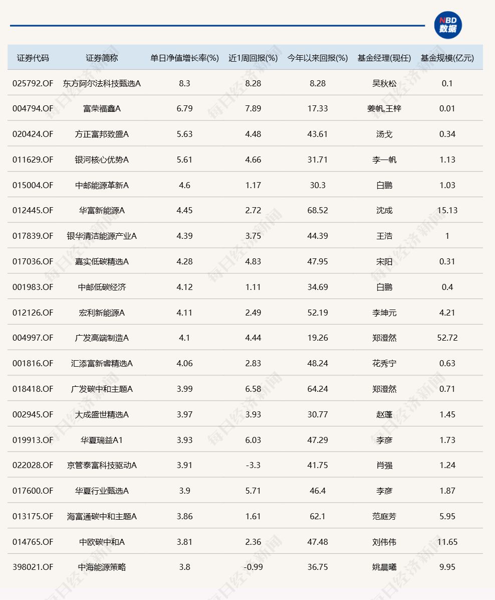 每经记者|肖芮冬 每经编辑|赵云 11月5日,市场全天震荡反弹,三大指数低开高走,全线收红。板块方面,电网设备、海南、电池等板块涨幅居前,量子科技、游戏等板块跌幅居前。全市场近3400只个股上涨。沪深两市成交额1.87万亿元,较上一个交易日缩量453亿。 下面一起来看今天公募基金的表现。 (注:榜单1、榜单2仅选取灵活配置型、偏股混合型和普通股票型三类产品作为主动基金的代表,纳入统计;债基相关榜单包括各类主、被动债券型基金) 1.单日涨幅榜
