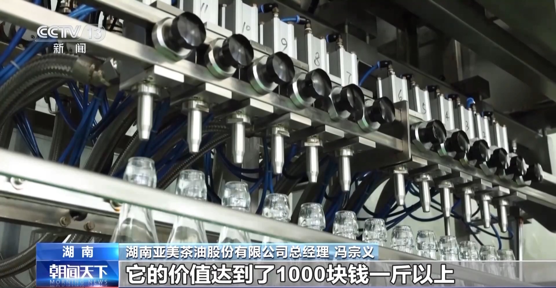 湖南亚美茶油股份有限公司总经理 冯宗义:茶油精油护肤品达到医用护肤级,原来茶油的价值是80至100块钱一斤,通过提纯得到的衍生品,它的价值达到了1000块钱一斤以上,那它的附加值就在原来的基础上提高了10倍以上。