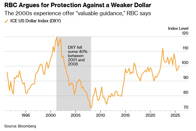 加拿大皇家银行资本市场(RBC Capital Markets)指出,一旦支撑美元的因素转为逆风,交易员应防范美元可能出现旷日持久的抛售,这种抛售可能重现互联网泡沫的繁荣与萧条周期。 ![]() (截图来源:彭博社) 今年以来,美元已因美国总统特朗普(Donald Trump)政策带来的不确定性而遭受重创。但飙升的股市和全球投资者(其中以规模庞大的被动投资基金最为突出)对美国资产的配置支撑了美元。 加拿大皇家银行货币策略师Richard Cochinos表示,过去二十年来,这些全球投资者一直青睐价格日益高昂的美国资产,尤其是股票,而资金流动反过来又推高了美元汇率。 Cochinos在一份报告中写道:“这种集中投资策略在过去15年中运作良好,但在当前环境下却存在风险。需求(以及相对表现)的显著变化都可能对外汇市场产生深远影响。” 他写道,一旦在遭遇冲击后资本开始分散配置,如同2000年互联网泡沫破灭后那样,就将预示美元出现大幅下跌——其幅度类似于美元从2001年到2008年从峰值到谷底下跌40%。 ![]() (截图来源:彭博社) 美元面临的挑战 Cochinos还指出,在未来几年中,美元面临的挑战包括高估值、贸易范式变化以及不断变化的避险天堂等因素,并强调“随着我们迈向2026年,长期尾部风险管理应当成为首要关注点”。 为对冲美元价值长期下跌的风险,RBC建议交易员采用多种策略——从ICE美元指数的合成看涨期权,到针对欧元和日元的看涨二元期权。 RBC分析师们还推荐更为常规的结构,包括: 两年期的欧元/美元看涨期权,执行价1.30(意味着美元下跌约12%); 两年期的美元/日元看跌期权,执行价130(意味着美元下跌约15%)。 RBC的分析还指出,当前的市场环境与2000年代存在显著差异,尤其是非流动性资产与私人资产投资的兴起,这类投资在市场压力时期可能加剧金融市场的波动。 Cochinos写道:“2000年之后时期的历史经验提供了宝贵的指导,但当今技术变革、地缘政治紧张局势以及货币政策试验的独特组合,要求我们进行一定的调整,因为资产配置框架已不再是传统意义上的。”