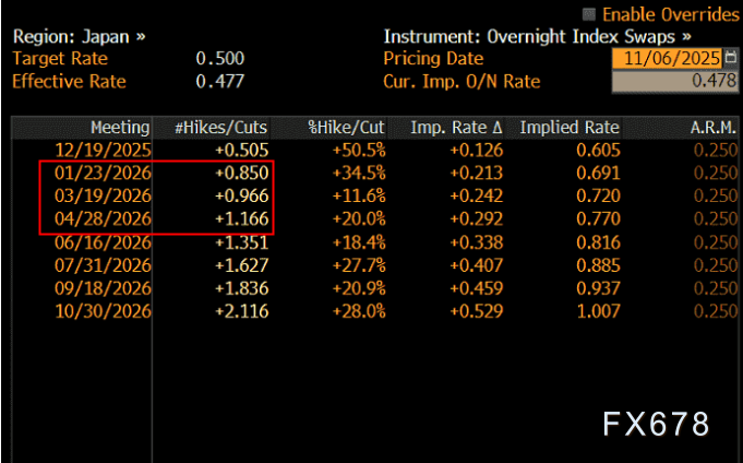 周四(11月6日)亚欧时段美元兑日元小幅震荡,目前跌0.1%交投于153.95附近,汇价周三走出了大幅探底回升走势后尾盘加速拉伸一度接近9个月前高。 ![]() 日本央行等待支持加息的数据关键牌 日本央行希望在加息前看到薪资增长动能,但今日公布的9月薪资收入水平同比下滑1.4%数据可能未能达标,凭借可等待的政治缓冲空间,12月加息绝非板上钉钉。 9月日本实际工资连续第九个月同比下滑,植田和男行期明确表示,希望在2026年春季薪资谈判初期看到明确增长动能,这一表态表明日本央行并不急于行动,暗示需等到明年一季度,央行才能做出确定性评估。 植田的谨慎立场具备合理性——过去两年工会达成的年度大幅加薪协议,尚未在更广泛的经济领域形成传导效应。 通胀环境下,日本薪资持续走弱,令市场质疑日本央行能否催生可持续的需求驱动型通胀压力。 植田和男行长即将发表的讲话或成关键变量,尤其是在上月东京CPI意外上行之后。不过,鉴于政界领导人呼吁谨慎施策,且薪资增长乏力,即便通胀持续偏离目标,日本央行也暂无迫切加息压力。 不过,日本央行上周发布特殊公告,宣布植田和男将于12月1日发表讲话,而该时间点距下一份东京CPI报告仅数日之隔,这一安排值得重点关注,同时利率期货显示明年1-4月份日本央行加息的概率将快速上行。 ![]() 日本实际工资再度下滑 9月日本实际工资再度下滑,连续第九个月同比下降,核心因通胀增速持续跑赢薪资涨幅。 尽管名义现金收入同比增长1.9%,但经通胀调整后的实际工资下滑1.4%,凸显家庭购买力承压态势。 消费作为日本经济的核心支柱,实际收入的持续缩水仍是日本央行实现需求驱动型通胀的主要掣肘。 这一时间窗口或为央行提供操作空间,可借此为12月潜在政策调整预热市场,尤其是在上次东京CPI报告中,核心与整体通胀数据均出现大幅超预期上行之后。 从当前市场定价看,互换市场隐含日本央行12月19日会议加息25个基点的概率为50%,实际将结果视为胜负各半的博弈。 到明年3月春季薪资谈判全面推进时,市场已基本完全消化一次完整加息的预期。 汇市干预风险依然可控 尽管植田的讲话将是后续关键事件,但高市早苗首相本周的表态进一步强化了“日本央行政策行动压力温和”的市场认知。 财务大臣片山皋月周二重申,随着日元跌至1美元兑154.50附近的八个月以来新低,政府将以高度紧迫感密切监控汇市波动。其最新表态与上周五言论高度一致,表明东京方面的口头警告或为当前极限举措。 但高市早苗明确表示,日本在实现薪资增长支撑的可持续通胀方面仅完成半数进程,这一信号表明其不希望推动央行过早收紧政策。 这一立场与其“承袭前首相安倍晋三风格的政策鸽派”形象一致,暗示尽管通胀显著高于日本央行2%的政策目标,但她不愿冒险削弱经济增长或推动日元过度走强。 其鸽派立场使得财务大臣关于日元走势的警告可信度受限——毕竟美元兑日元向来是典型的利差驱动型交易品种。 除非获得基本面支撑——无论是日本央行转向鹰派推高本土债券收益率,还是美国国债收益率出现实质性下行——否则政府要求日本央行采取的任何汇市干预措施,都可能陷入收效甚微的境地。 技术分析: 目前美元兑日元依然守住上升通道上轨,但周二美元兑日元汇价在美元指数上涨的背景下依然下跌给市场留下了深刻影响,代表市场做空日元的热情明显下降,同时有资金开始逢低做多日元。 目前汇价依然受到通道上轨的支撑,同时持续收在下降趋势线上方,但面对美元近期可能达到阶段高点,以及随着日元加息进程的推进,美元兑日元调整风险日益加大,这里是顶部区域的可能也在增加。 ![]() 北京时间16:00,美元兑日元现报153.76/77。