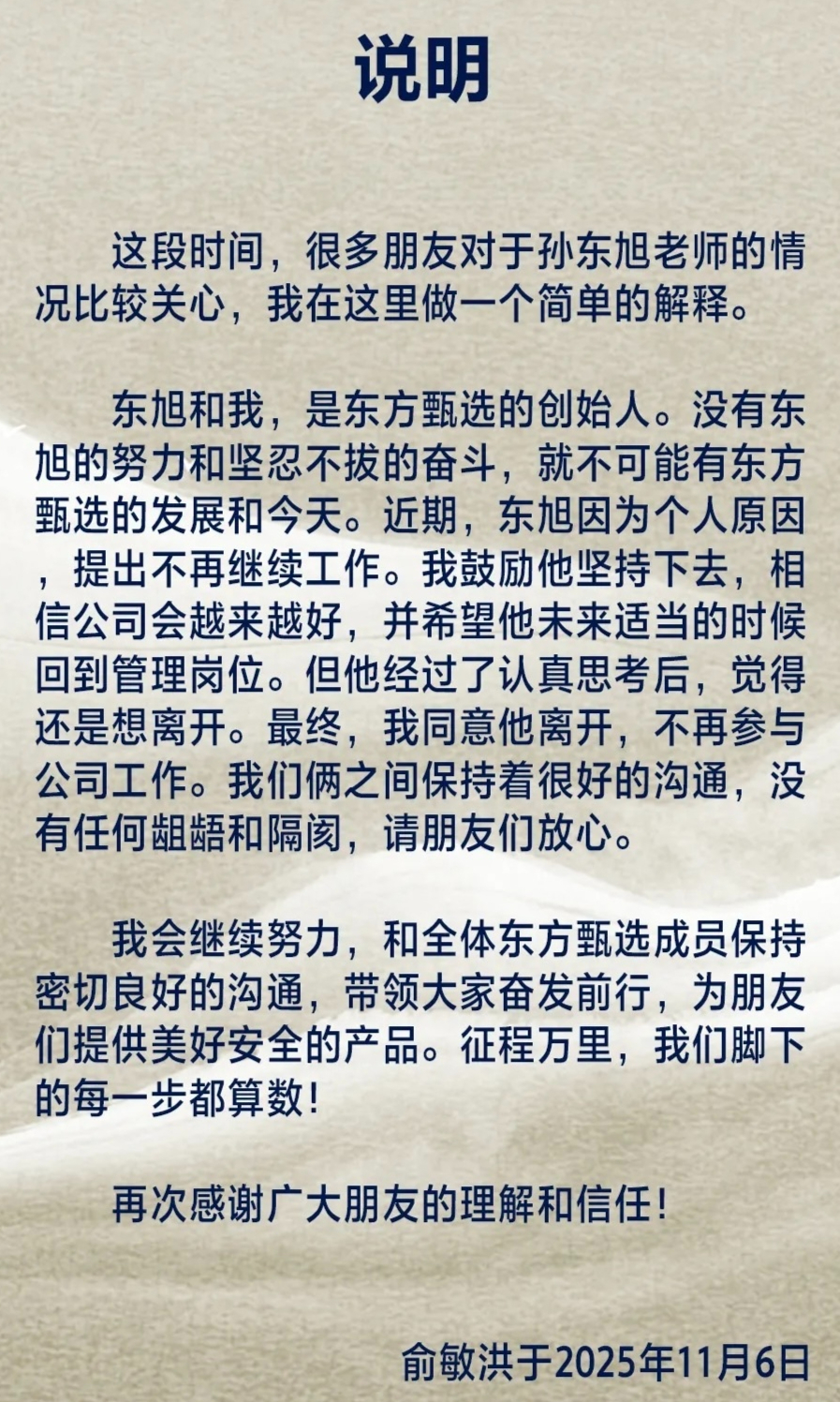每经记者|李宇彤 每经编辑|余婷婷 11月6日,新东方创始人、东方甄选行政总裁俞敏洪在其社交平台发布的一则说明称,东方甄选前CEO(首席执行官)孙东旭已正式离职。 至此,2023年底那场席卷直播间的“小作文”事件中,两位处于风暴眼的核心人物——董宇辉与孙东旭均已离开东方甄选。 俞敏洪在说明中表示:“近期,东旭因为个人原因提出不再继续工作。我鼓励他坚持下去,相信公司会越来越好,并希望他未来适当的时候回到管理岗位。但他经过了认真思考后,觉得还是想离开。最终,我同意他离开,不再参与公司工作。”但他同时也强调,“我们俩之间保持着很好的沟通,没有任何龃龉和隔阂,请朋友们放心。”