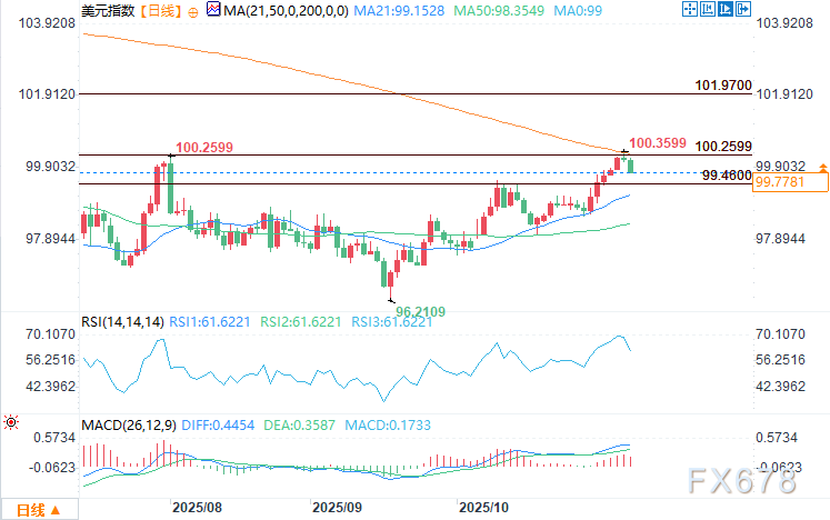 0周四(11月6日)美盘时段,劳动力市场疲软拖累美元和收益率,美元指数下跌,在本周早些时候尝试突破100.360失败后,其回调幅度扩大至200日均线以下。该指数下跌0.3%,至99.753。在裁员公告激增和美国国债收益率普 ...