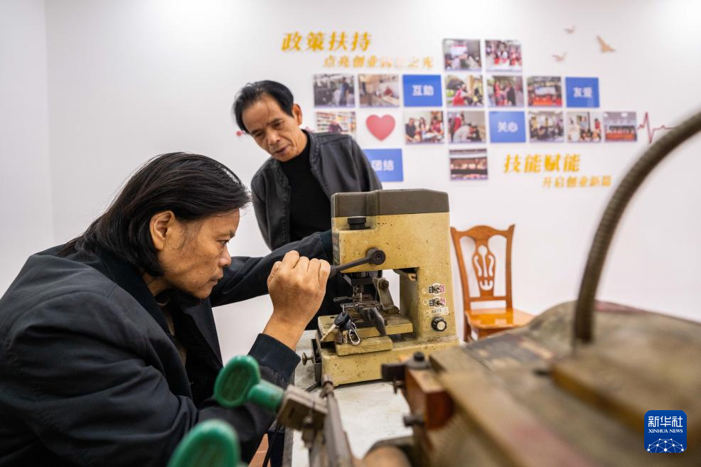 11月6日,在长沙市望城区高塘岭街道中南社区,行动不便的居民(左)在社区免费提供的助残小屋里为居民配钥匙。 近年来,湖南省长沙市望城区残联以长沙市残联推行的建设残疾人友好社区为契机,对社区办公场所、公共活动空间、居民小区等进行无障碍改造,从细节处打通残障居民出行的“最后一米”。同时积极对接辖区内医疗和校企资源,在残障群体健康管理、职业培训、转岗就业等方面做好服务工作,帮助更多残障人士走出家门,走进公共生活。 新华社记者 陈思汗 摄 |