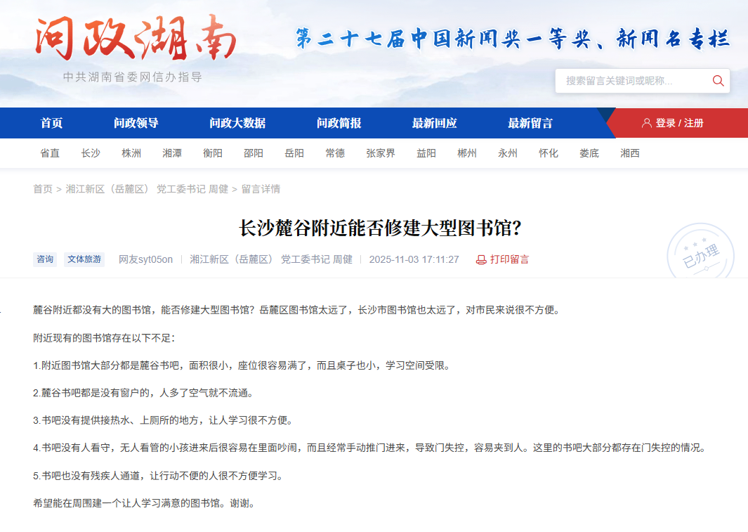 《问政湖南》网友的相关留言与官方回复截图。 红网时刻新闻11月7日讯(记者 陈星晓)近日,有网友通过红网《问政湖南》栏目反映,长沙高新区(麓谷)片区缺乏大型公共图书馆,现有社区书吧存在空间狭小、配套设施不足、管理缺位等问题,给市民学习带来不便,呼吁在周边修建一座功能完善的图书馆。 该网友在留言中详细列举了现有“麓谷书吧”的几大痛点:学习座位紧张且桌面过小,学习空间受限;空间密闭,空气流通不畅;缺乏热水、卫生间等基本服务设施;由于无人值守,时常有孩童嬉闹影响学习环境,且门因频繁手动推拉易失灵,存在安全隐患;此外,无障碍通道的缺失也让行动不便者难以利用。