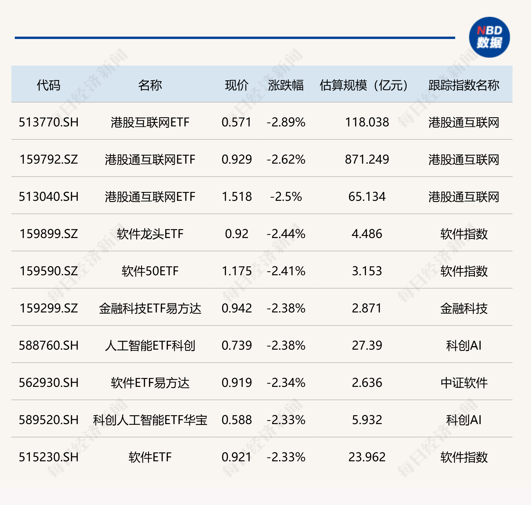 有券商表示,当下化工品盈利或已筑底,基本面下行风险充分释放,化工白马有望迎来估值与盈利双击修复。供给短缺约束的行业率先迎来弹性,建议重视需求确定性向上的方向,重视化工高分红资源股价值重估。 下跌方面,港股互联网相关ETF跌超2%。