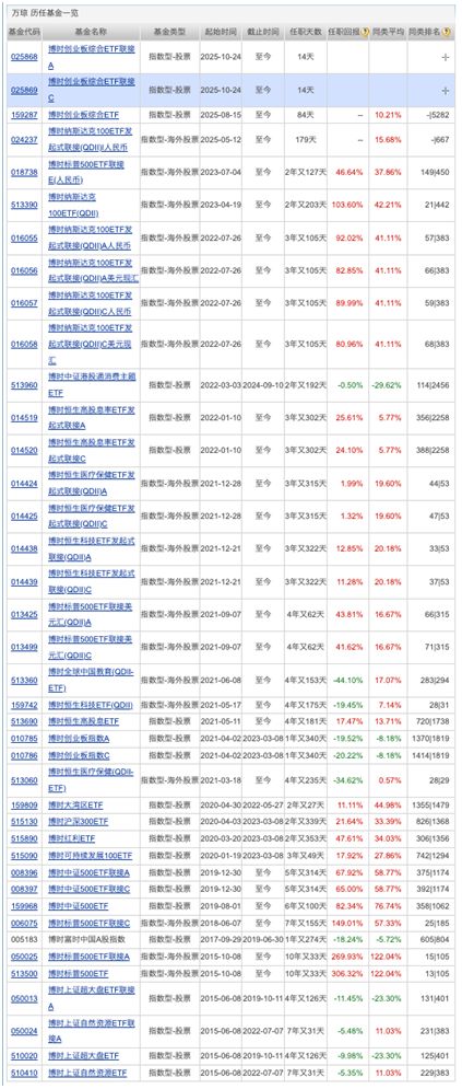 2、ETF主题机会 当前,化工品价格、价差处于底部区域,龙头白马估值亦跌至底部水平。从龙头公司周期底部业绩测算来看,该估值具有强安全边际。叠加龙头白马产业链一体化、规模、成本优势明显,储备项目充足,中长期有望在当前扩产周期中保持市场份额与盈利能力持续增长,化工核心资产有望迎来盈利与估值修复。可关注化工ETF等产品。 四、明日重点关注新发基金1、基金简称:博时创业板综合ETF联接 基金类型:ETF联接基金 基金经理:万琼 业绩比较基准:创业板综合指数收益率×95%+银行活期存款税后利率×5% 基金经理部分过往业绩: