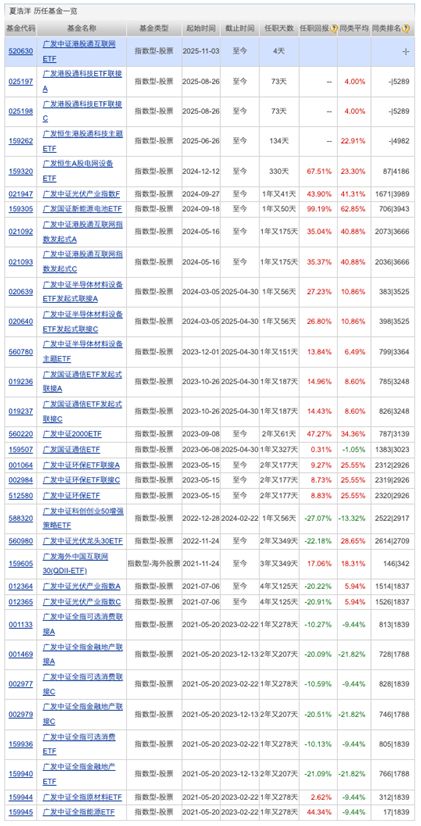 2、基金简称:广发中证港股通互联网ETF 基金类型:股票型、指数型证券投资基金 基金经理:夏浩洋 业绩比较基准:同期中证港股通互联网指数收益率(使用估值汇率折算) 基金经理部分过往业绩: