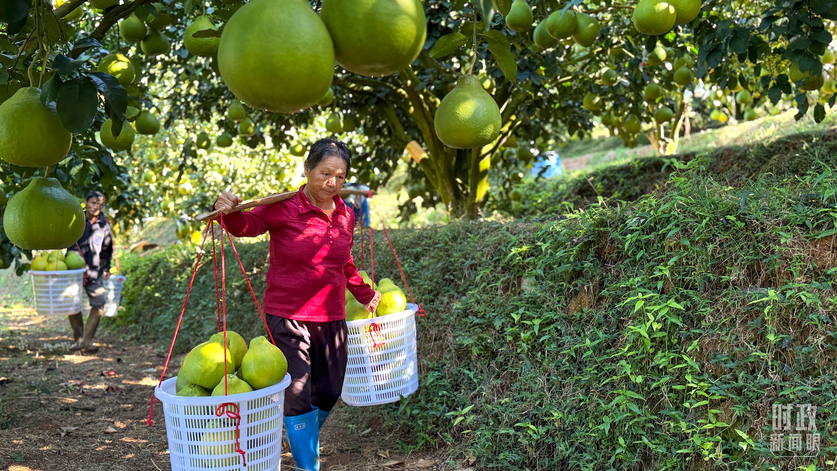 △南福金柚种植基地,柚林迎来丰收。(总台记者吴媚苗、总台央视记者鄂介甫拍摄) 梅州是中国金柚之乡,“梅县金柚”2021年获国家地理标志农产品保护认证,其种植历史已有100多年。